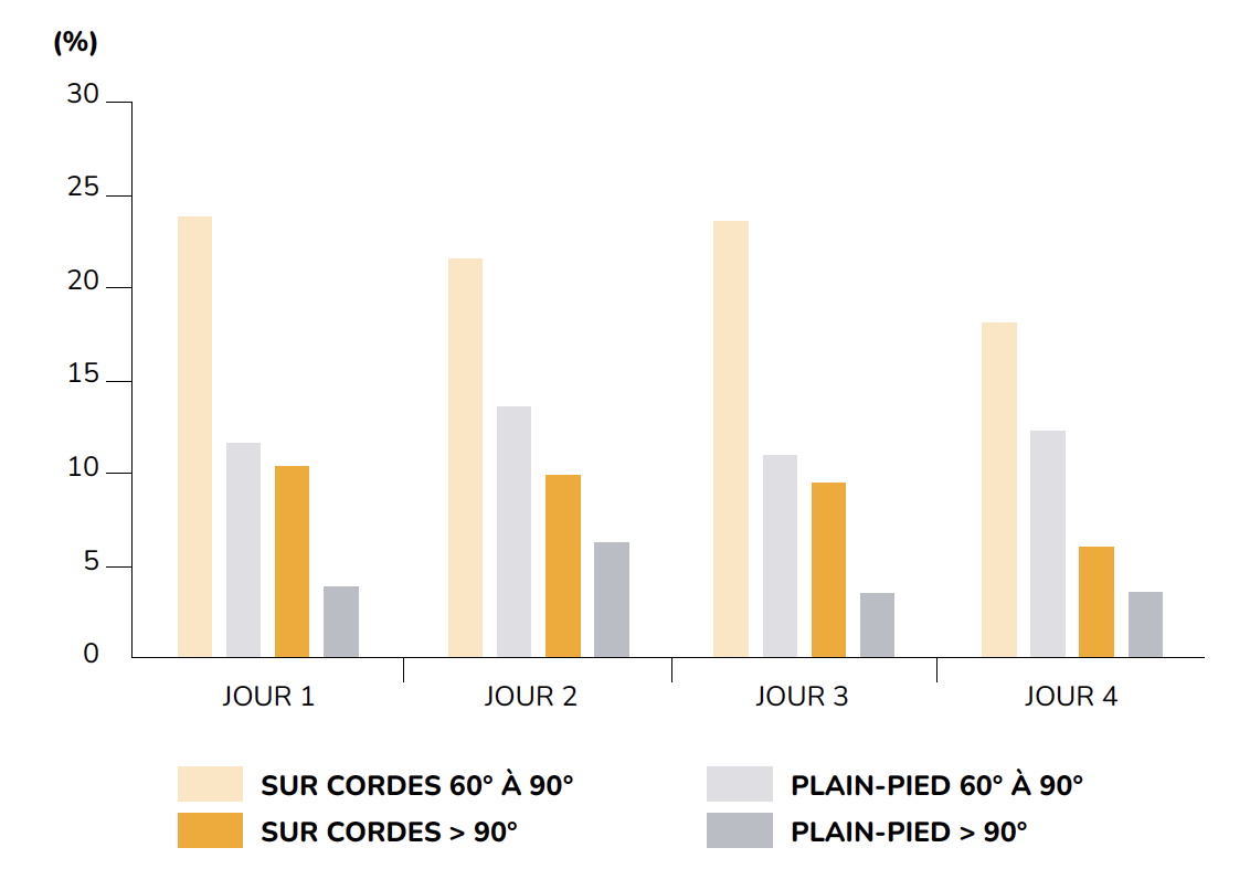 Répartition en pourcentage des élévations du bras « à risque » (60° à 90°) et « fort risque » (> 90°) sur cordes ou de plain-pied au cours de la semaine de travail.